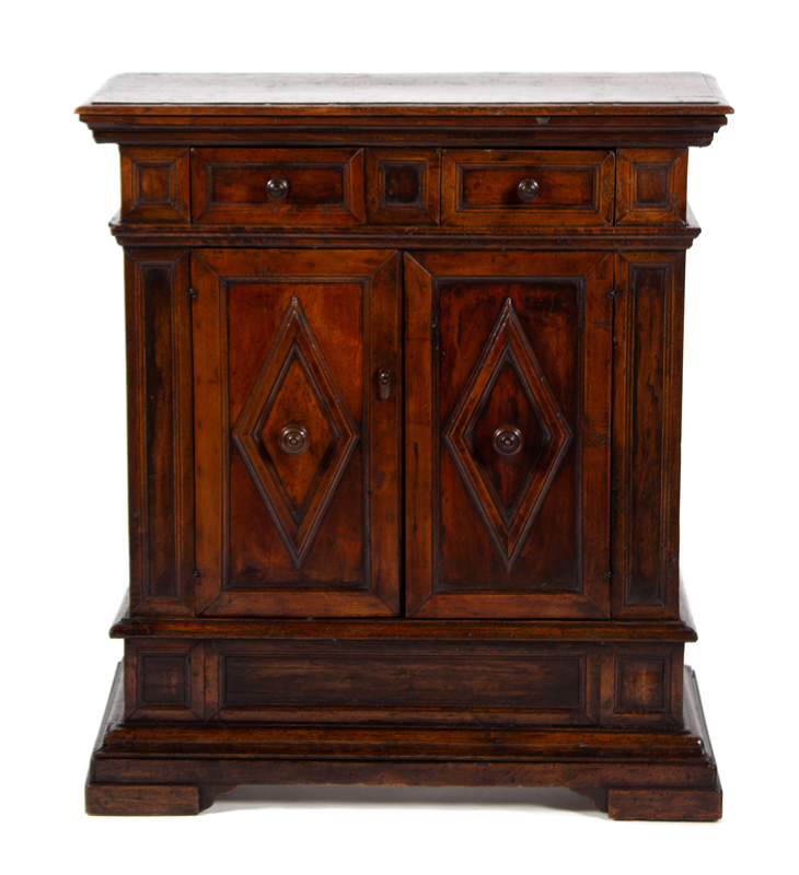 The rectangular top above two drawers over a pair of cupboard doors, raised on bracket feet.