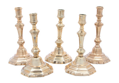 19TH CENTURY Comprising a pair and a similar set of three, each with tapered octagonal shaft raised on a scalloped octagonal base. Height 9 1/4 x width of base 5 1/2 inches.