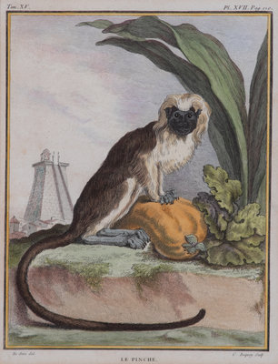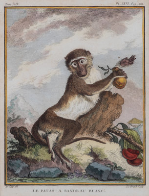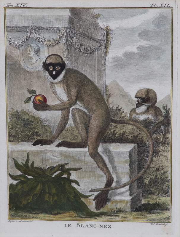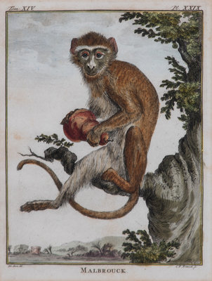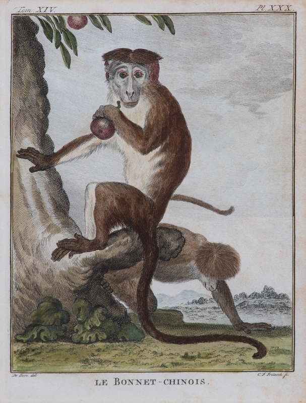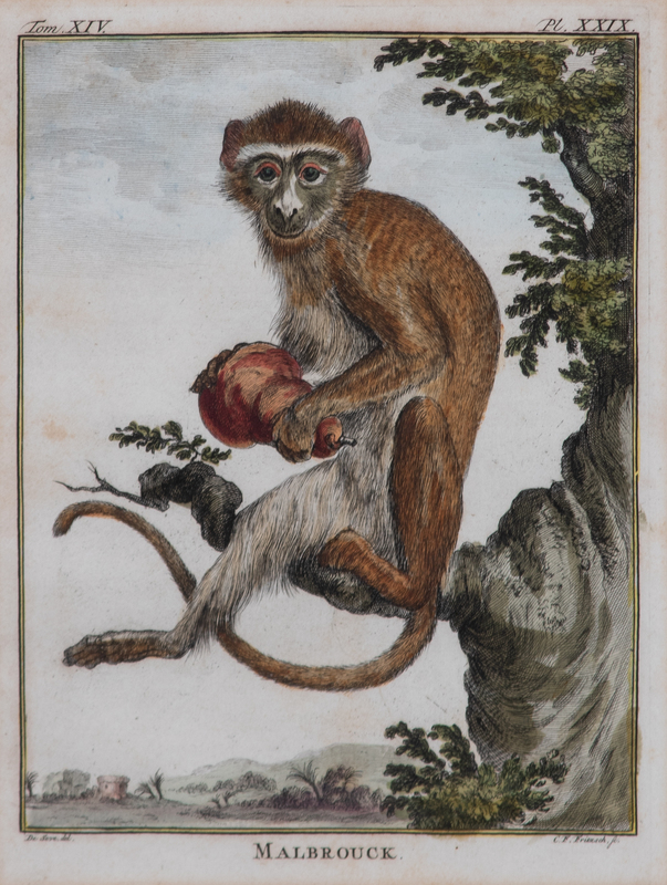 Comprising: Malbrouck, after Jacques de Seve (active 1744-1788), engraved by Christian Friedrich Fritzsch, Le Bonnet Chinois, after Jacques de Seve (active 1744-1788), engraved by Christian Friedrich Fritzsch, Le Blanc-Nez, after Bylaert, engraved by Christian Friedrich Fritzch, Le Patas A Bandeau, after Jacques de Seve (active 1744-1788), engraved by Le Grand, and Le Pinche, after Jacques de Seve (active 1744-1788), engraved by C. Baquay, each contained in a gilt-stippled ebonized wood frame.