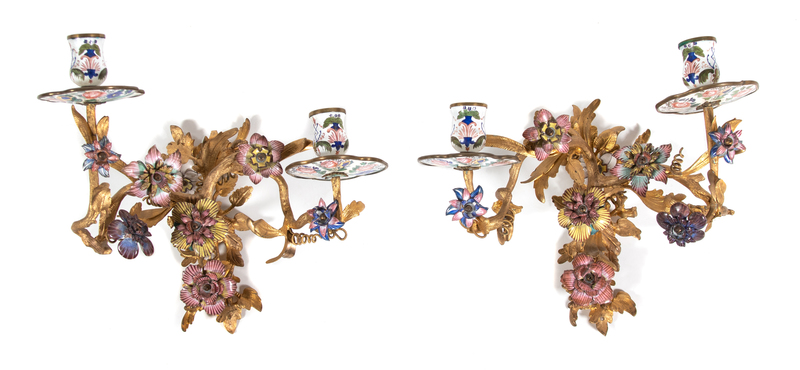 A Pair of Rococo Style Gilt-Bronze and Enamel Two-Light Sconces