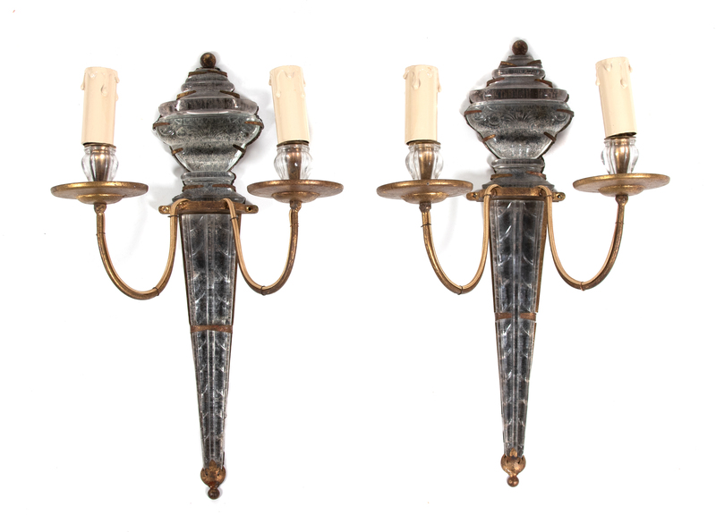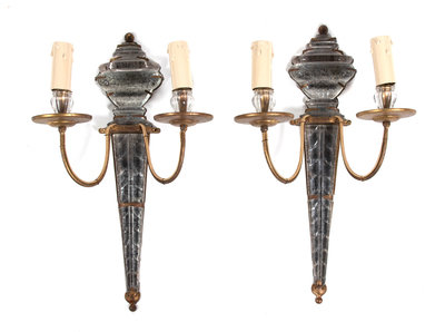 Each molded glass urn and tapered foliate shaft backed in silver foil, mounted with two gilt-metal candlearms; electrified (cord cut). Height 18 x width 11 1/2 inches.