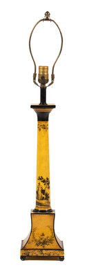 Decorated toward the base on the standard with a landscape in black on a yellow ground, raised on a spreading square base decorated with floral garlands.Height excluding fittings.