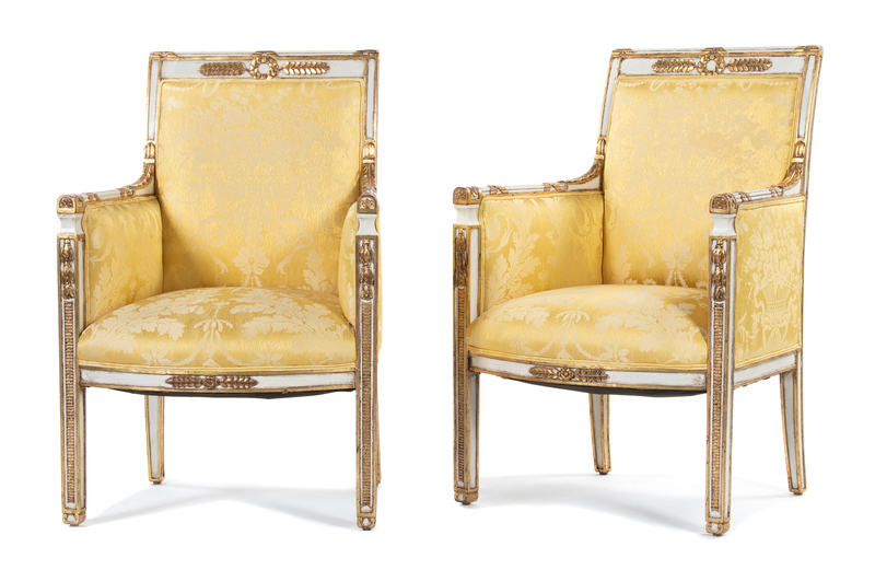 A Pair of Directoire Style Parcel-Gilt and Cream-Painted Armchairs