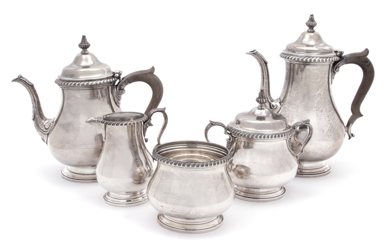 Comprising teapot, coffeepot, covered sugar, creamer and wastebowl. Approximately 71 oz