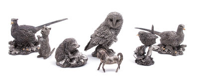 Comprising a hedgehog, a barn owl, a pair of pheasants, a Scottie and a bird; together with a silvered metal figure of a horse. (7 pieces) Heights 2 1/4 to 5 inches.
