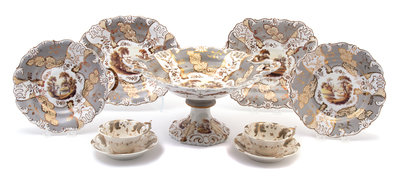 Comprising:12 plates (two restored)3 shaped circular single-handled dishes2 shaped square two-handled dishes (one cracked)1 shaped oval two-handled dish1 footed compote (one handle repaired)Together with eight similar Rockingham porcelain cups and eight saucers.