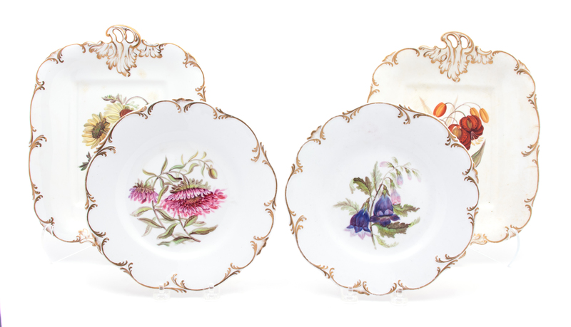 Comprising four dishes and two two-handled serving dishes; each painted with a different specimen within gilt scrolled borders.