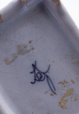 Each of rectangular form with canted corners, decorated on one side with a maiden before a bird perched in a flowering shrub, the reverse wtih two figures, the sides with a crane amidst vegetation; factory marks in underglaze blue.