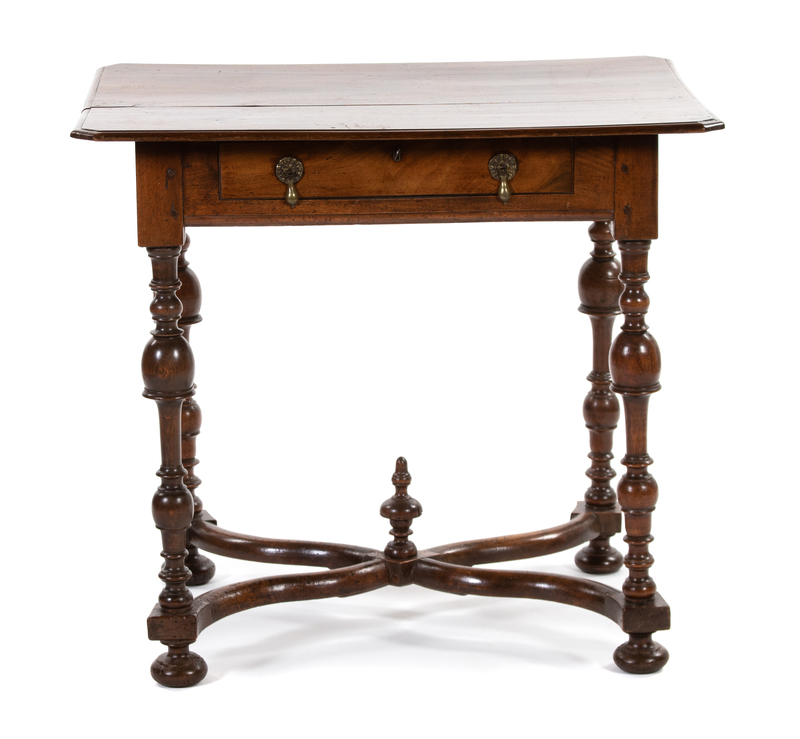 The rectangular top with canted corners over a single drawer, raised on inverted chalice and baluster-turned legs joined by stretchers.