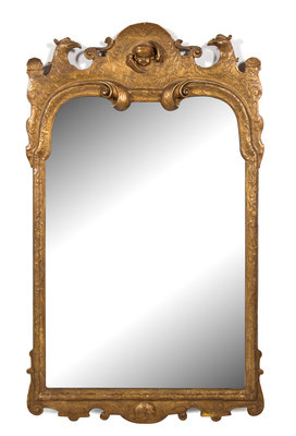 The beveled mirror plate with scrolled cresting centered by a cherub head flanked by opposed phoenix heads and shells, a shell pendant below.