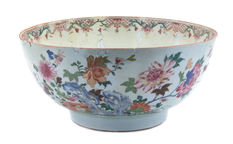 EARLY 19TH CENTURYThe interior painted with floral sprigs, the exterior with large floral sprigs in gilt, blue, iron-red, and green (extensive restorations).Height 7 3/8 x diameter 15 1/4 inches.