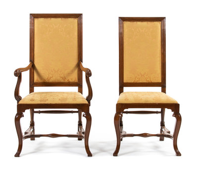 Comprising two arm and eight side chairs, each with molded rectangular back above a flared drop-in seat, raised on cabriole legs joined by stretchers.