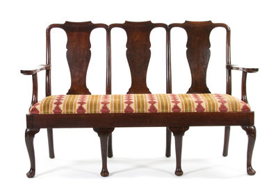 The crestrail above three solid vasiform splats and outscrolled arms, the drop-in seat raised on cabriole legs ending in pad feet.
