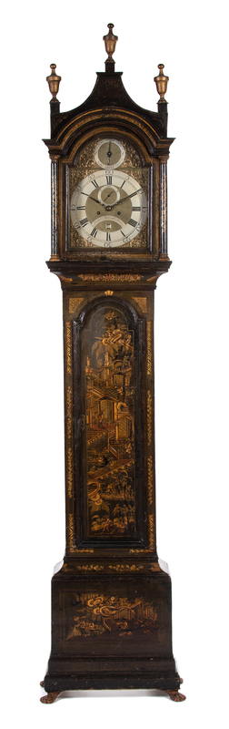 With strike/silent, seconds and calendar dials, raised on animal paw feet; with pendulum, winder and key.