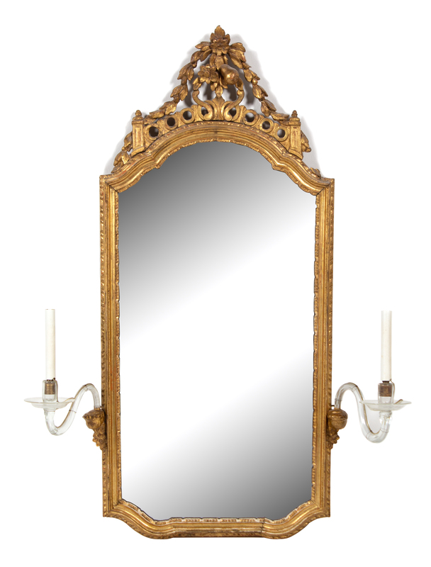 The shaped mirror plate with pierced flowerhead and bellflower pendant crest, later mounted with glass candle arms; electrified.