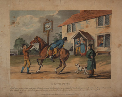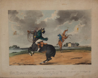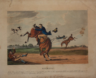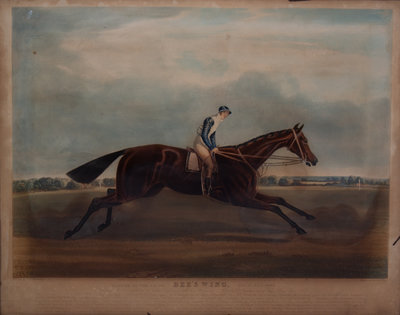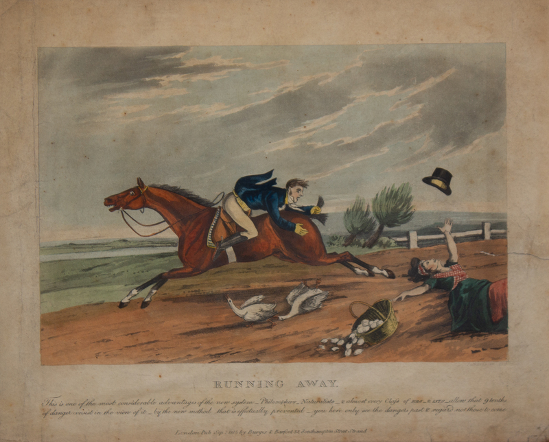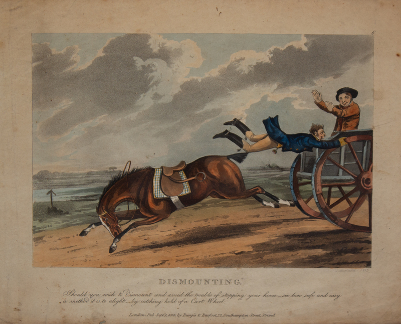 Comprising a set of five colored prints after Sutherland, published by Burgis & Barfoot, 22 Southampton Street, Strand, London, Sept. 1, 1815, comprising Mounting, Kicking, Running Away, Dismounting and Rearing, each in a maple frame; the last titled Winner of the Ascot, Bee's Wing, Gold Cup 1842, after J. F. Herring, engraved by Charles Hunt, published J. Moore, London, June 20th, 1842; maple frame.