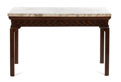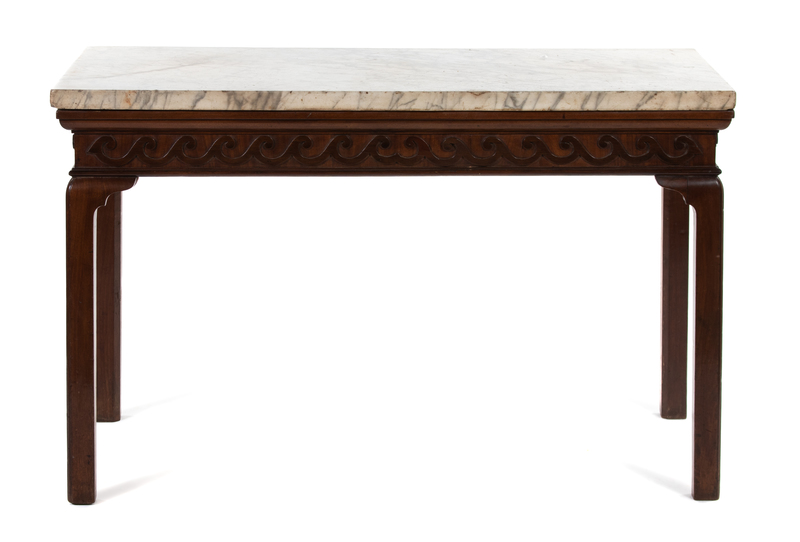 The rectangular grey-veined white marble top above an applied Vitruvian scroll frieze, raised on square legs.