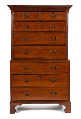 In two parts, the upper with projecting cornice above two short and three long drawers, the lower section with three long drawers, raised on bracket feet.