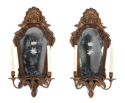 Each beveled mirror plate reverse-cut with a central star and coronet, with shell and acorn and leaf pendant cresting, the base mounted with two scrolled candlearms; electrified.