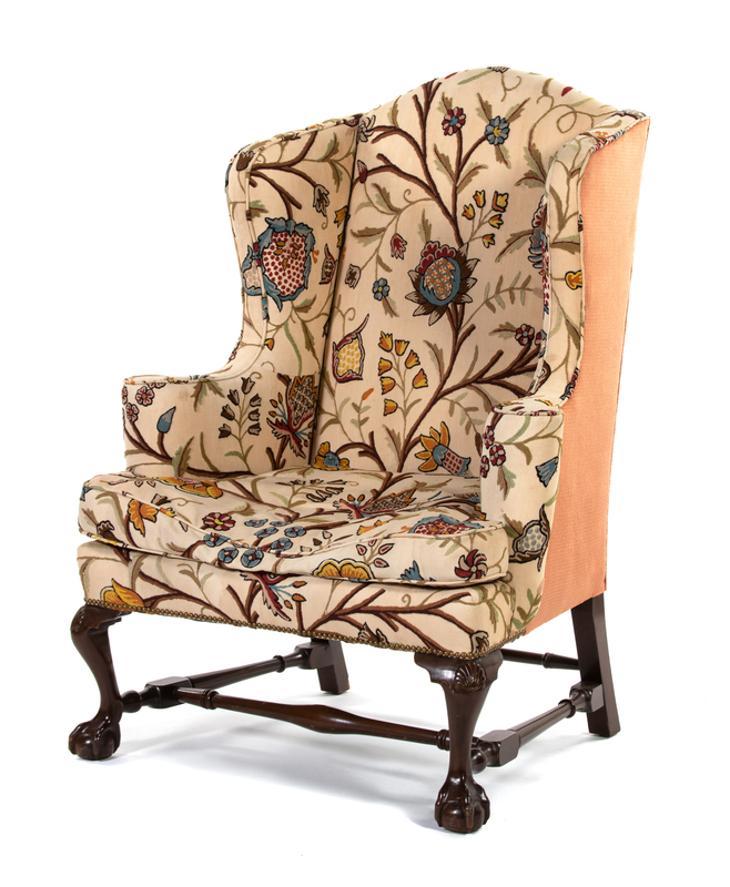 The arched back above wings leading to outscrolled arms, the flared seat raised on cabriole legs joined by stretchers, on claw-and-ball feet; the front upholstered in crewelwork, the sides and back in butternut chenille.