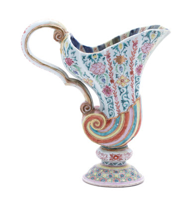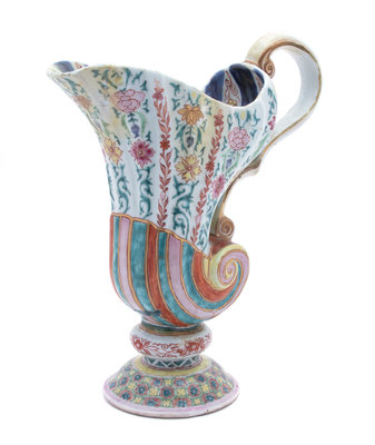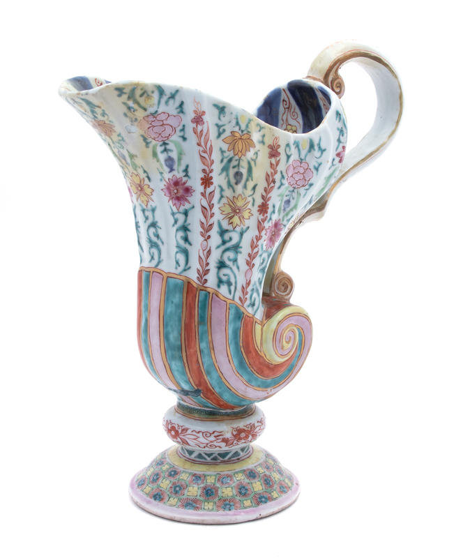 LATE 18TH/EARLY 19TH CENTURY of silver shape, the fluted and scrolled body brightly painted in yellow, red, pink and green with flowering vines and symbols, with scrolled handle, raised on a domed circular foot.(restorations). Height 11 inches x width 10 inches x depth 3 1/2 inches.
