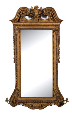 The swan's-neck cresting centered by a shell and leaf-decorated cartouche over the rectangular mirror plate, a shell-carved pendant below, with two associated brass candlearms.