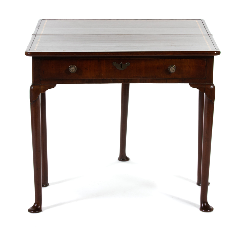 The hinged rectangular top with rounded corners opening to a later gilt-stamped brown leather surface, the frieze fitted with a single long drawer, raised on tapering cylindrical legs ending in pad feet.