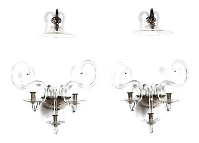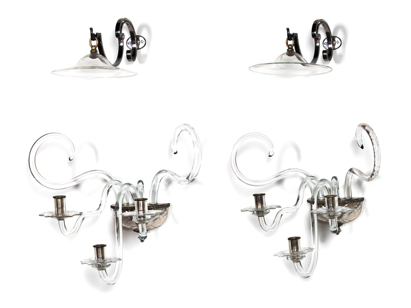 Each with cut-glass and silvered metal wall plate supporting three scrolled glass candlearms and two clear glass scrolls, the separate silvered metal arm supporting a circular shade (one with cracks).