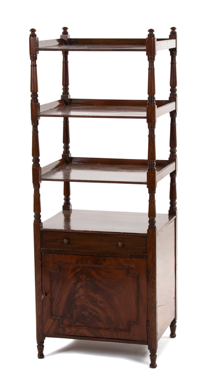 With four rectangular platforms flanked by balluster-turned supports, a drawer and cupboard door below, raised on turned feet.