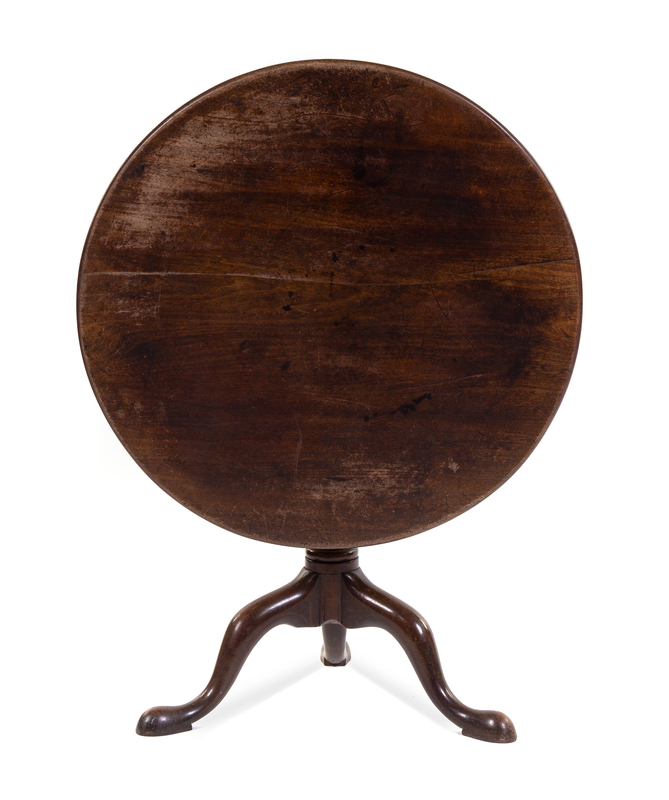 The hinged circular top above the ring-turned cylindrical tapering support terminating in a tripartite base with snake feet.