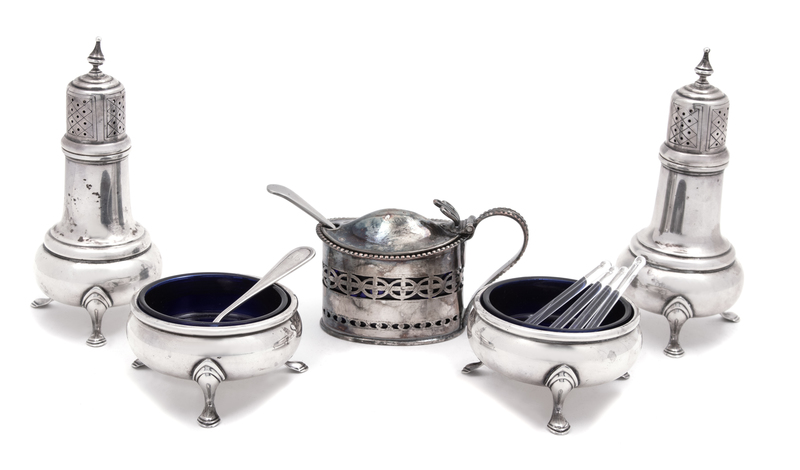 Comprising a pair of Whiting George II style silver salts, with cobalt blue glass liners, four glass spoons with shell-form bowls, a Daniel & Arter 'Nevada Silver' spoon, a silverplate mustard pot with cobalt blue glass liner and Frank Whiting silver spoon, and a pair of George II style silver casters.