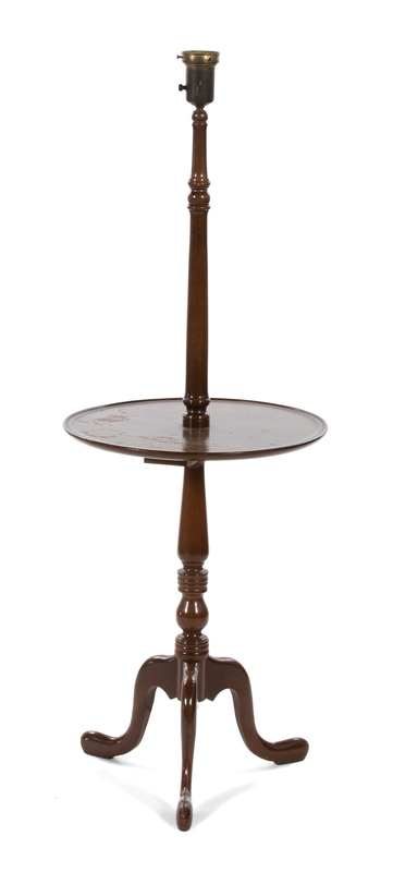 The turned cylindrical shaft above a dished platform over a baluster-turned support, raised on three cabriole legs ending in snake feet.