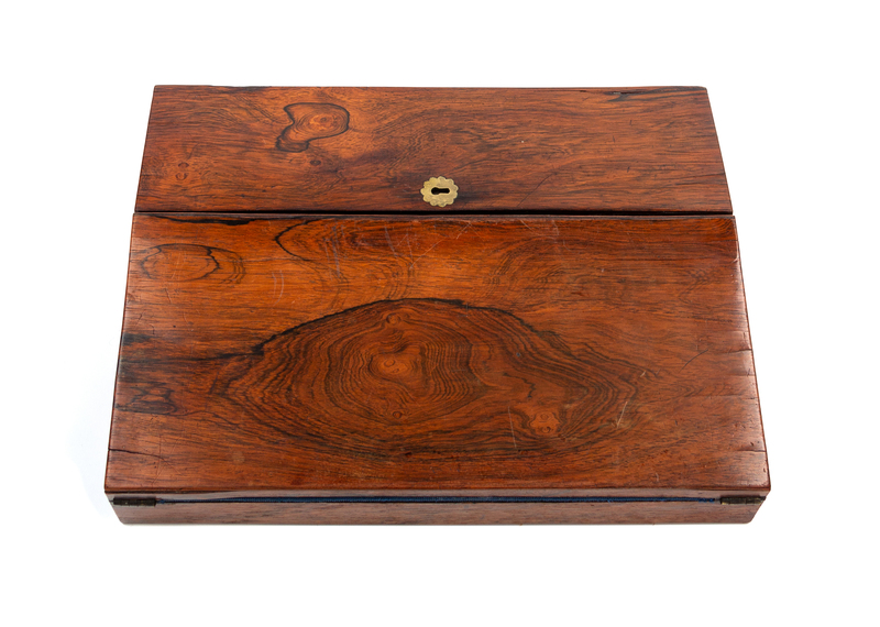 The slant-front opening to two inkpots, a tray and lidded compartments before a velvet-lined writing surface.