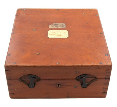 The fitted case with an attached label from the National Physical Laboratory-Teddington, and additional accessories.