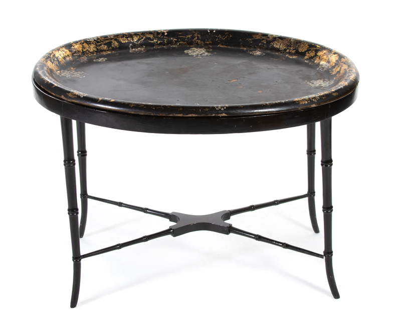 The oval tray decorated with scattered floral sprays on a black ground with gilt foliate vine borders (worn), the later stand on bamboo-turned legs joined nu an X-form stretcher.