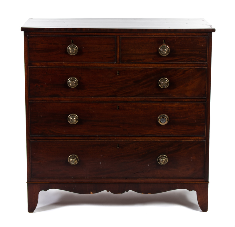 The rectangular top above two short and three cockbeaded long drawers, raised on bracket feet.
