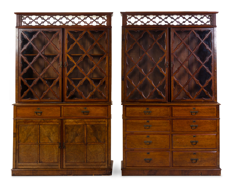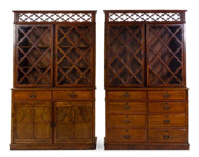 Each in two parts, the superstructure with an openwork pierce-carved frieze above two glazed doors opening to shelves, the base fitted with eight drawers, raised on a plinth base.