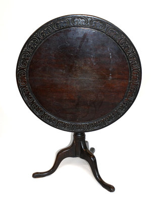 The circular top carved with a foliate band, revolving on a birdcage support on a baluster-turned standard on three cabriole legs ending in snake feet (repairs).