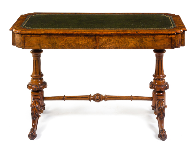 The rectangular top with rounded corners above the conforming frieze, raised on twin cylindrical fluted supports carved with foliate decoration and ending in scroll feet, joined by a conforming stretcher.