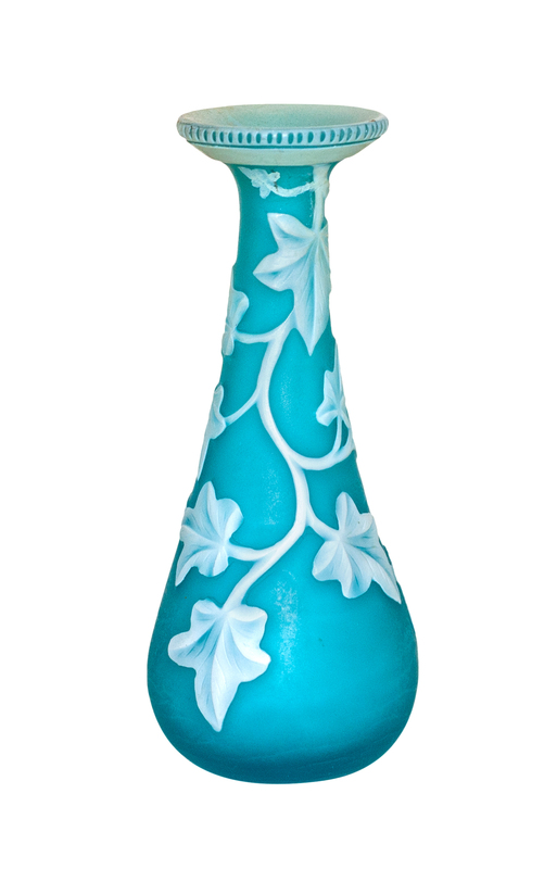 the swelling cylindrical body cut from white to turquoise with leafy vines.