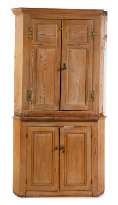 In two parts, each section fitted with two paneled doors opening to shelves.