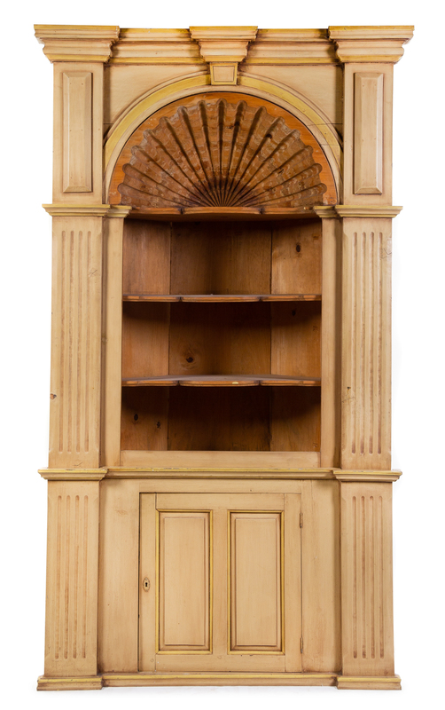 in two parts, the superstructure having a molded projecting cornice of blockfront outline above the case fitted with three lobed shelves, the upper shelf carved to show a concave sunburst, the base fitted with a paneled door opening to a vacant interior, the whole flanked by fluted pilasters.