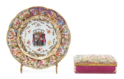 Comprising an armorial plate and a covered box decorated with a scene of putti in landscape.