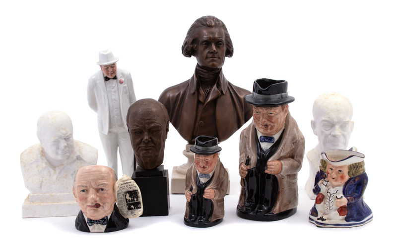 Comprising an Alva Studios copper-clad reproduction bust of Thomas Jefferson, a Royal Doulton porcelain Winston Churchill small Toby jug, a Royal Doulton porcelain figure of a standing Winston Churchill, a larger Royal Doulton porcelain Winston Churchill Toby jug, a small Royal Doulton porcelain mug, a copper clad bust of Winston Churchill, a Spode limited edition bust of Dwight Eisenhower, a Spode porcelain bust of Winston Churchill, and a 19th Cntury Stafforshire toby jug.