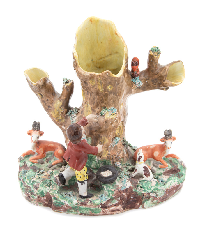 Modeled as a young boy retrieving eggs from a nest, surrounded by deer, a god and squirrel (restorations).