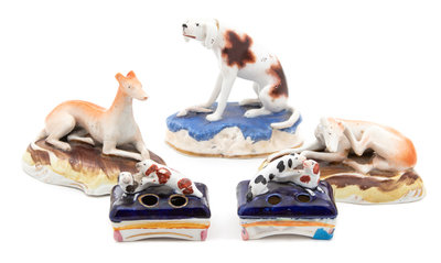 Comprising a figure of a brown-spotted hound, a pair of recumbent whippets, and a pair of spaniel-form pen rests.