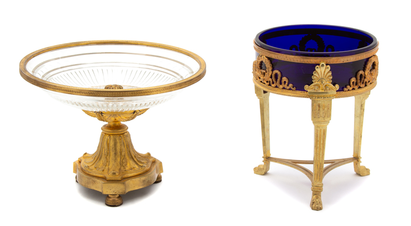 Comprising a tazza with cut glass bowl, and a cobalt glass bowl on stand.