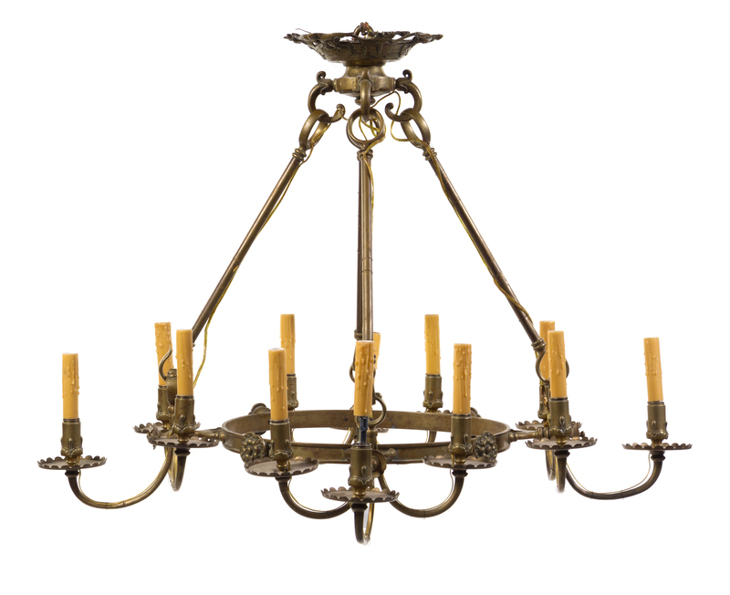The circular frame hung from rods and issuing four groups of three scrolling candle arms.