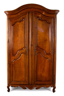 The molded cornice over two paneled doors opening to a plain interior, a scrolled apron below, raised on scroll-carved feet.