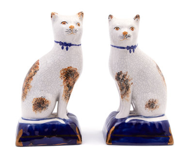 Each animal depicted with blue ribbon-tied collar, resting on a gilt-decorated cobalt-blue-glazed pillow.